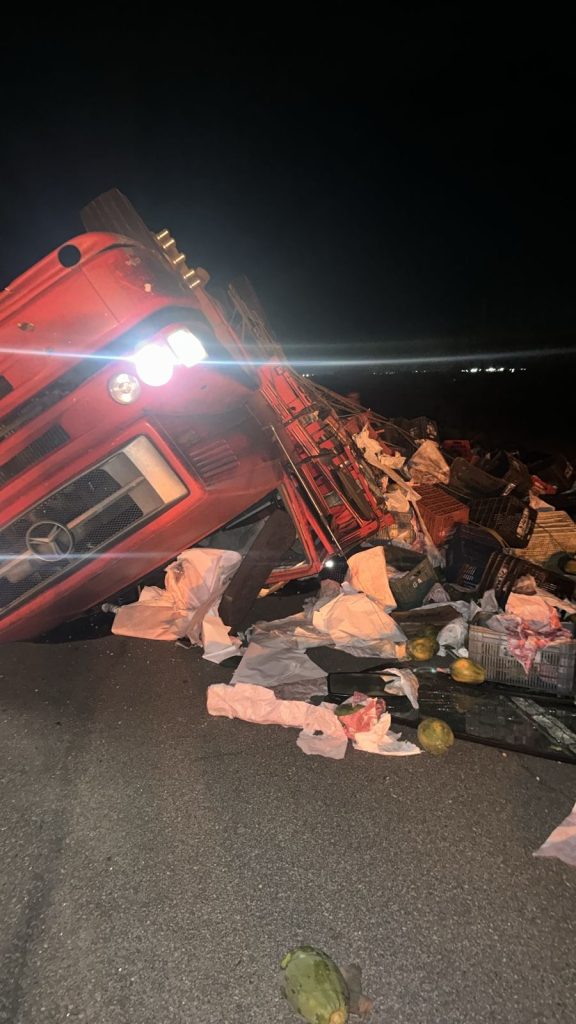 Um caminhão Mercedes-Benz carregado de mamão capotou na noite deste sábado (16) no anel viário de Caicó, no Seridó potiguar. De acordo com informações preliminares, o veículo perdeu o controle e tombou às margens da via. A carga ficou espalhada pela estrada, o que exigiu atenção redobrada dos motoristas que trafegavam pelo local. O condutor […]